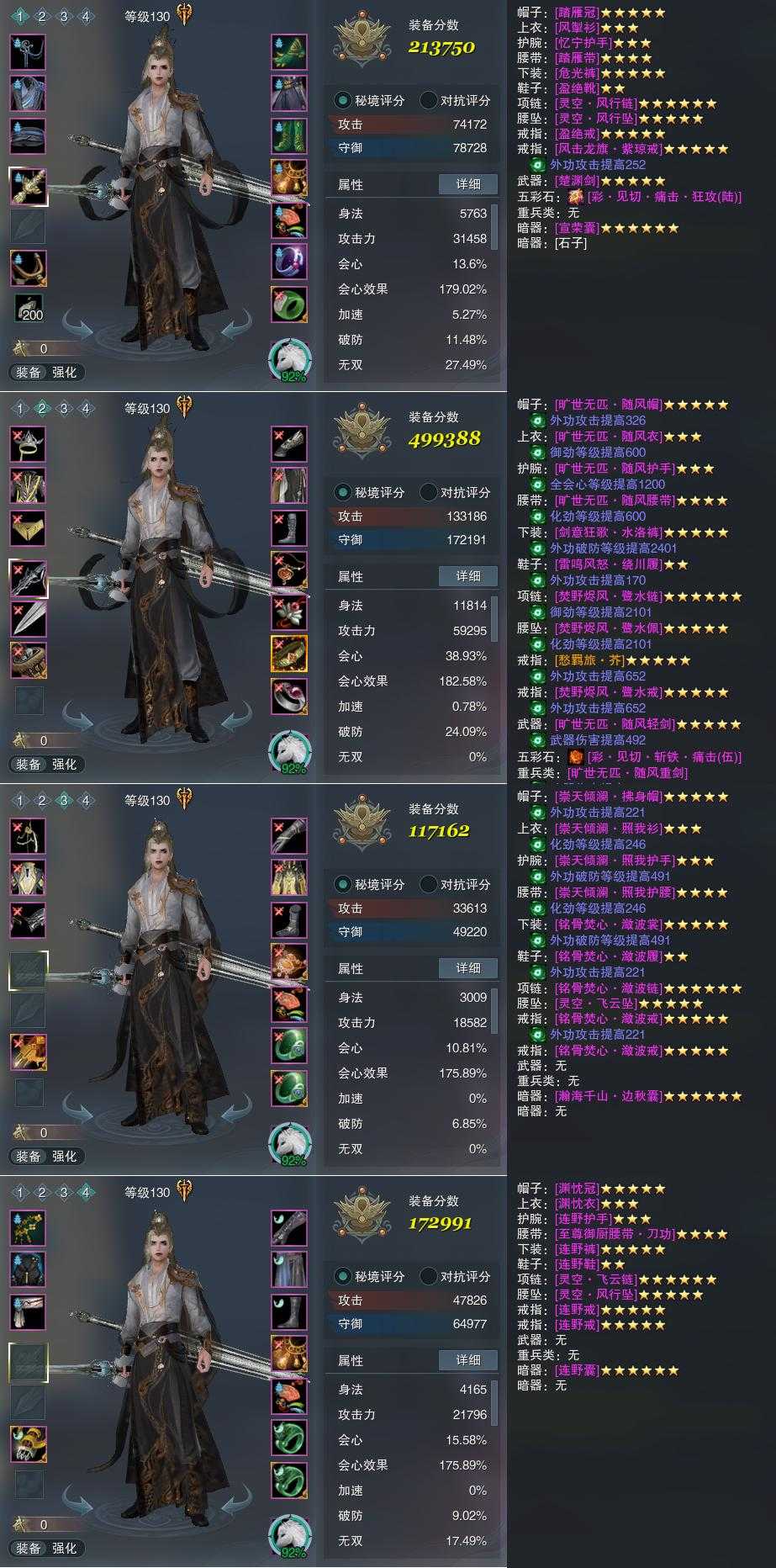 【装备】130级,装备一213750,山居剑意/问水诀PVP499388,装备三117162,装备四172991