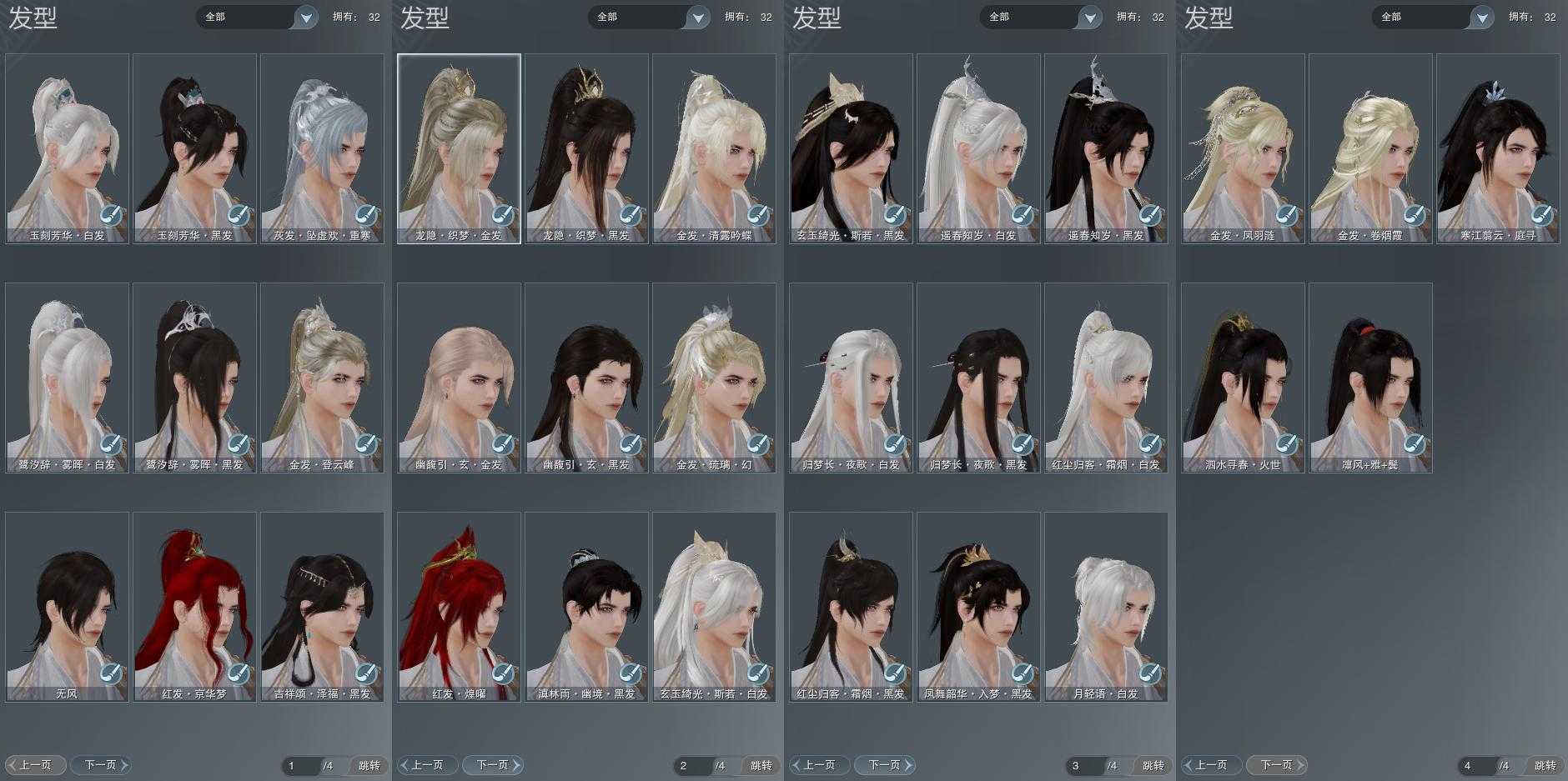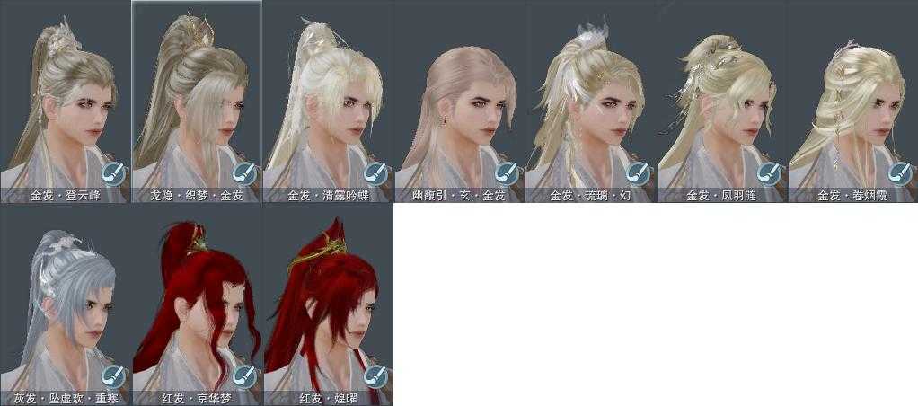 【发型】金发7个[角金, 凤金, 海金, 水母金, 三代金, 黑幽馥金发, 白龙隐金发], 红发3个[兔红, 龙红, 三代灰银], 黑发14个, 白发7个, 盒子发型[入梦黑发, 白红尘黑发, 月轻语白发, 白红尘白发, 蓝琵琶黑发, 红梅盒黑发, 蓝琵琶白发, 红梅盒白发, 白玄玉黑发, 黑傣族黑发, 白雪人白发, 黑幽馥黑发, 白龙隐黑发, 红藏袍黑发, 白鹭黑发, 白鹭白发], 总页数4