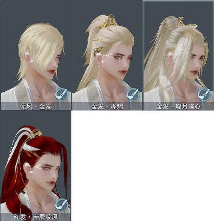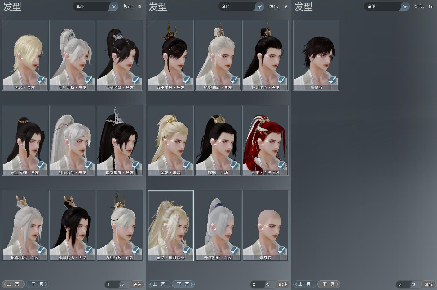 【发型】金发3个[狐金, 猪金, 无风金发], 红发1个[八红], 黑发9个, 白发6个, 盒子发型[四代七夕黑发, 乘风黑发, 四代七夕白发, 五代七夕黑发, 乘风白发, 五代七夕白发, 红梅盒黑发, 幽涧愀兮白发], 总页数3