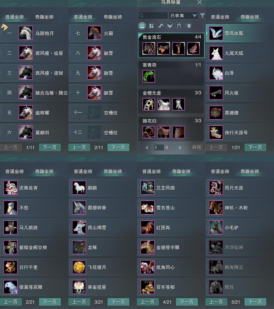 【坐骑】10个[踏炎腾云, 西风瘦逐狱, 西风瘦追星, 乌蹄抱月]