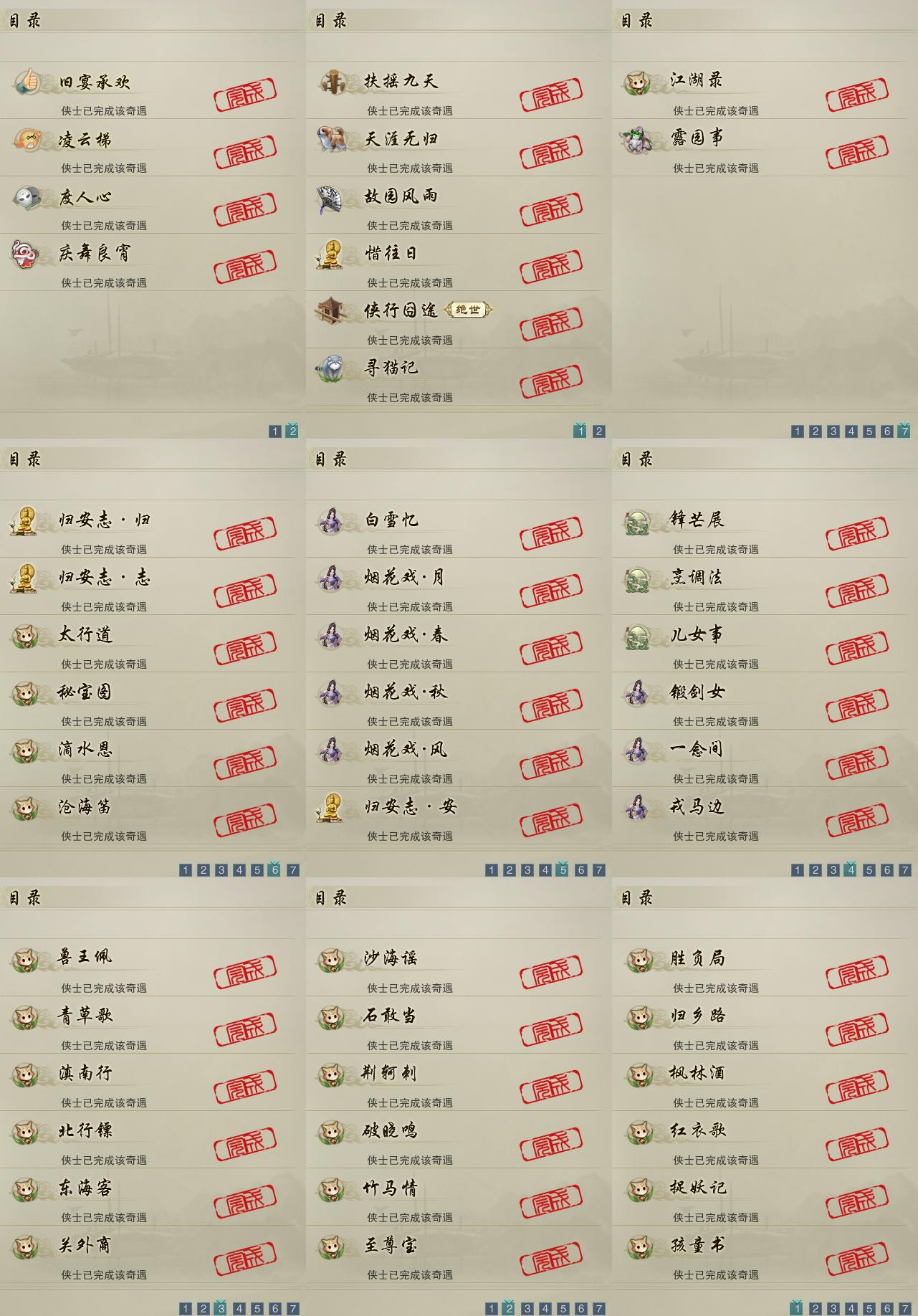【奇遇】10个[天涯无归, 惜往日, 扶摇九天, 故园风雨, 侠行囧途, 寻猫记, 庆舞良宵, 凌云梯, 度人心, 旧宴承欢]