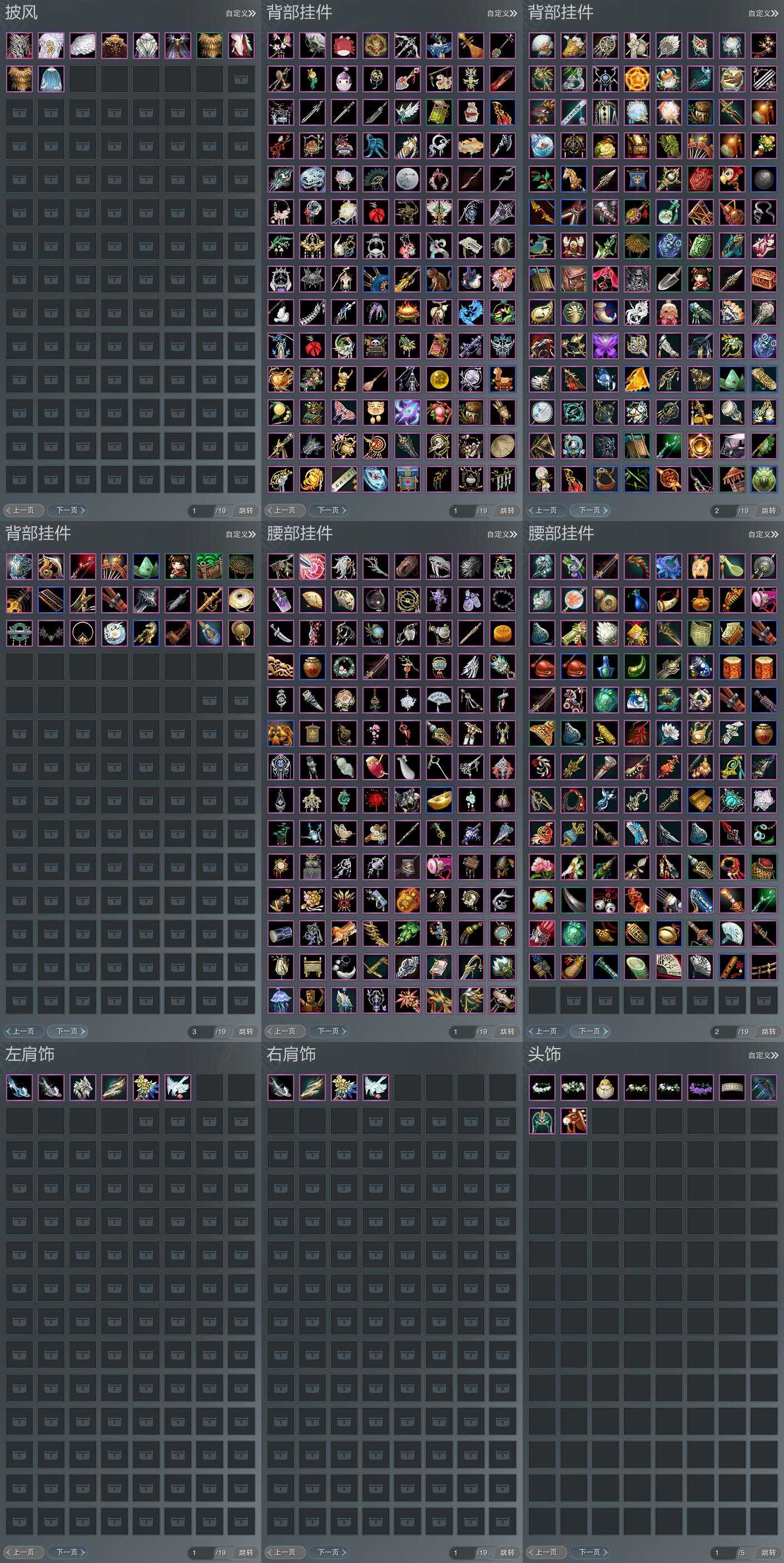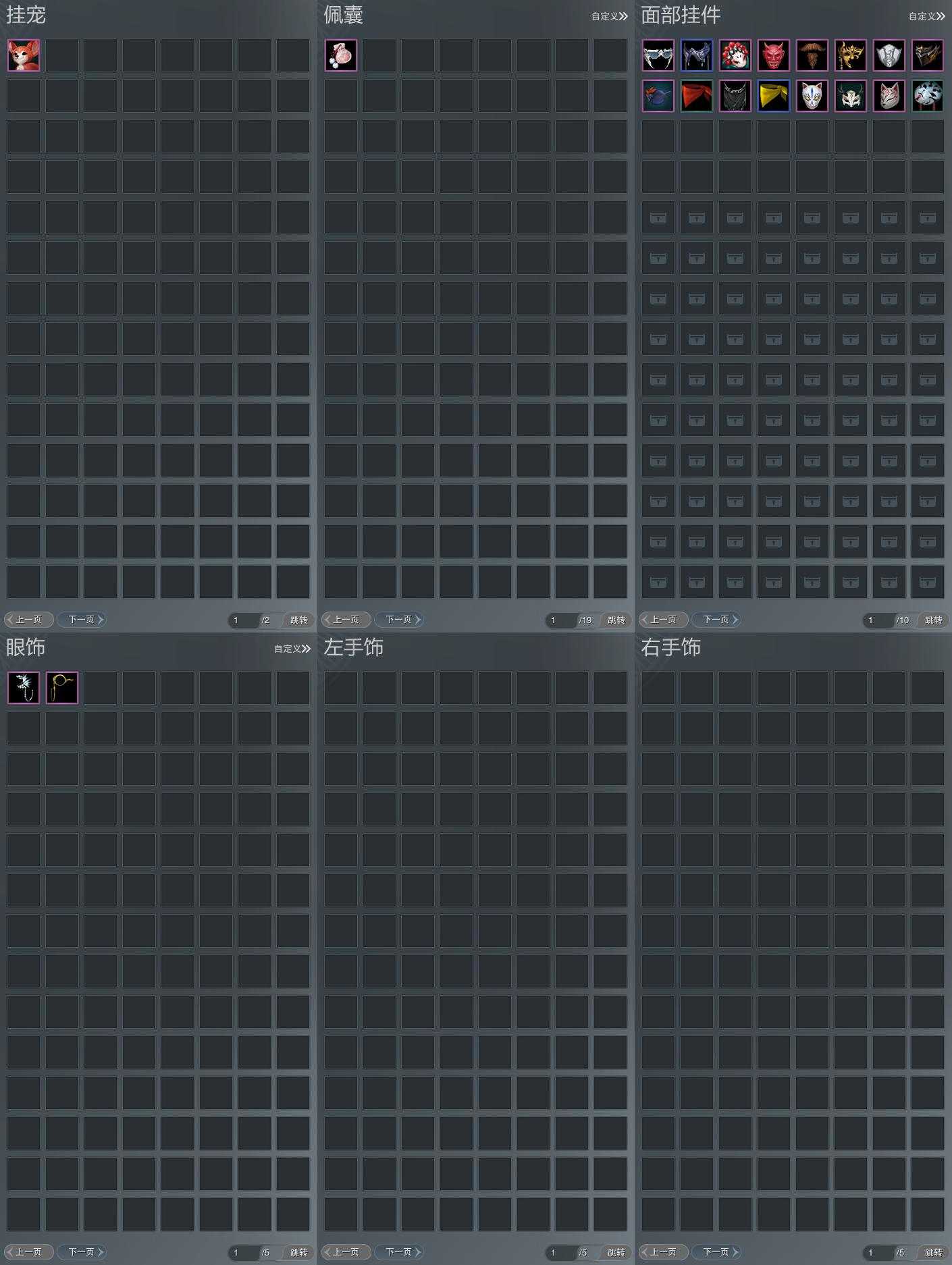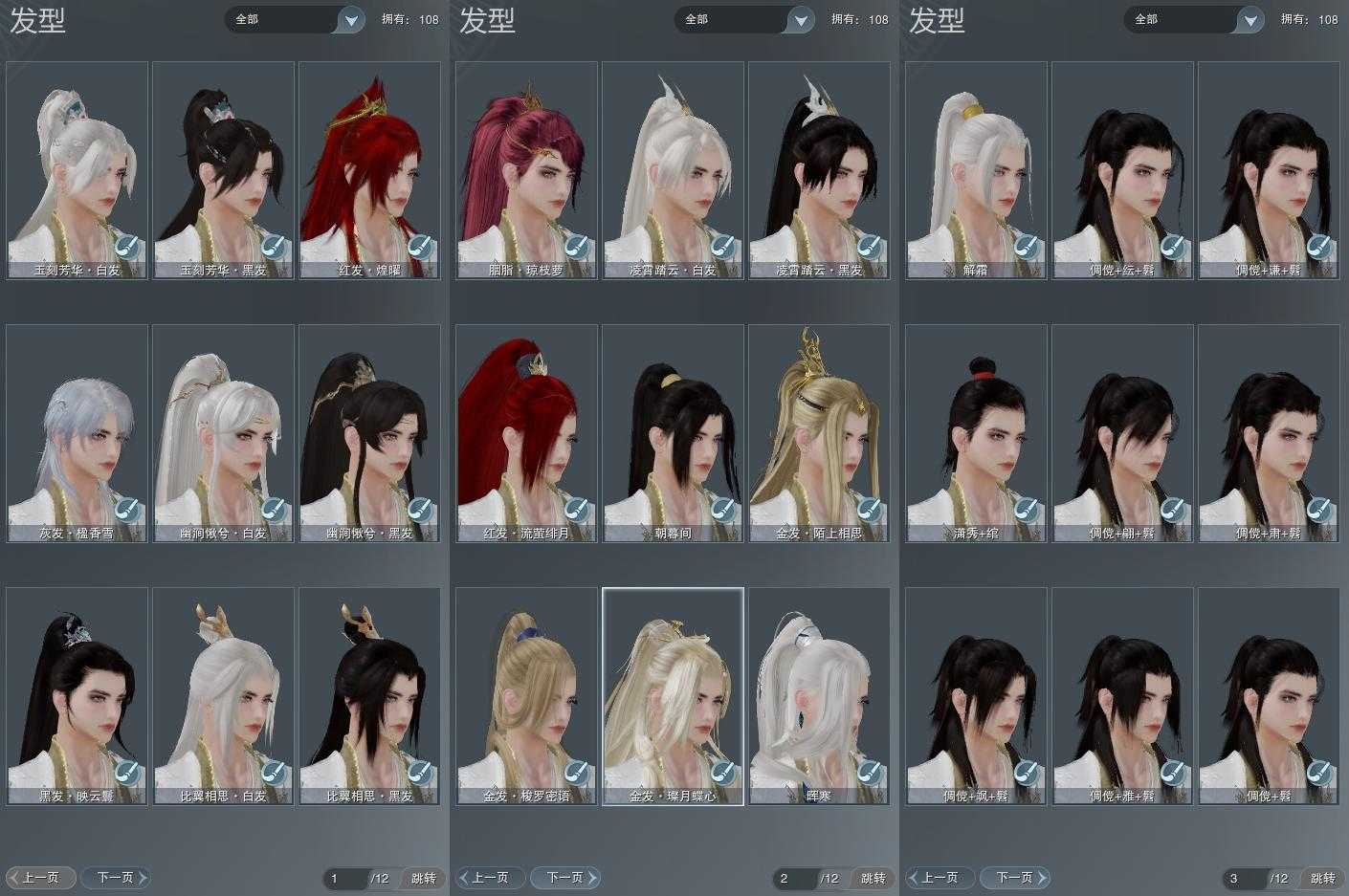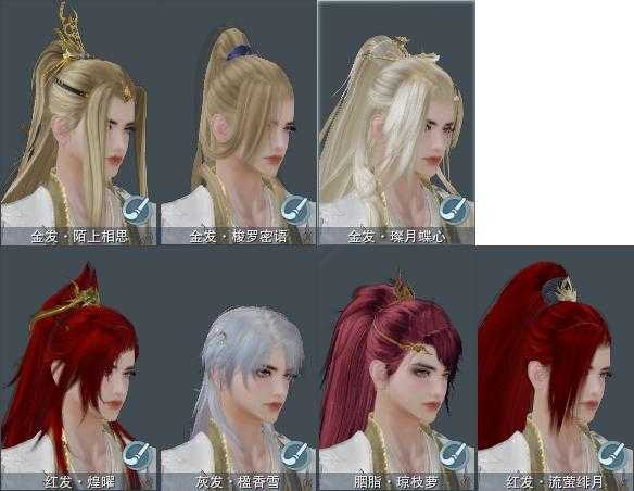 【发型】金发4个[狐金, 资历金, 考金, 无风金发], 红发5个[五红, 紫发, 兔红, 小资历红, 一代灰], 黑发6个, 白发6个, 盒子发型[踏云黑发, 踏云白发, 五代七夕黑发, 五代七夕白发, 幽涧愀兮白发], 总页数3
