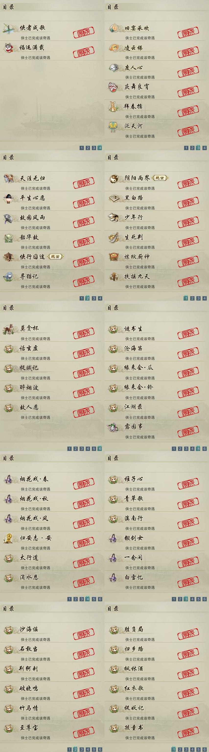 【奇遇】20个[天涯无归, 阴阳两界, 平生心愿, 黑白路, 韶华故, 少年行, 故园风雨, 扶摇九天, 侠行囧途, 寻猫记, 庆舞良宵, 生死判, 凌云梯, 炼狱厨神, 度人心, 旧宴承欢, 泛天河, 侠者成歌, 拜春擂, 福运满载]